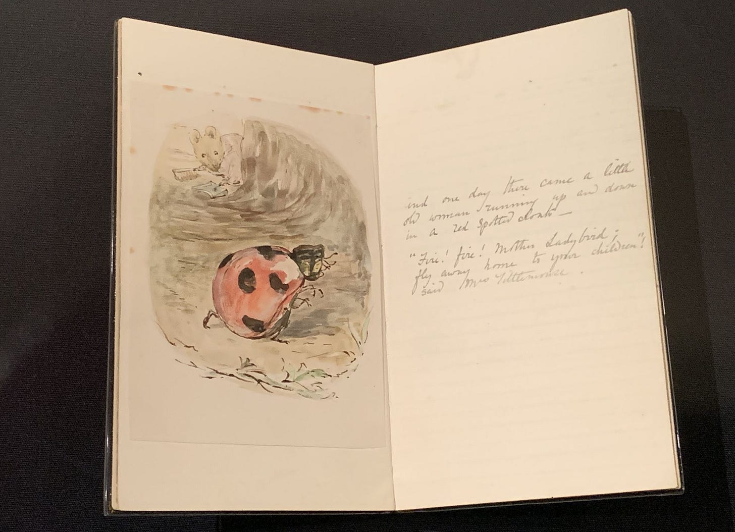 Here, from the British Museum, are the artist-author’s original watercolour illustrations for the ever-popular story; and nearby you’ll see – what a treasure! – the manuscript, on loan from the Victoria and Albert Museum, of The Tale of Mrs Tittle-Mouse, published that same year.