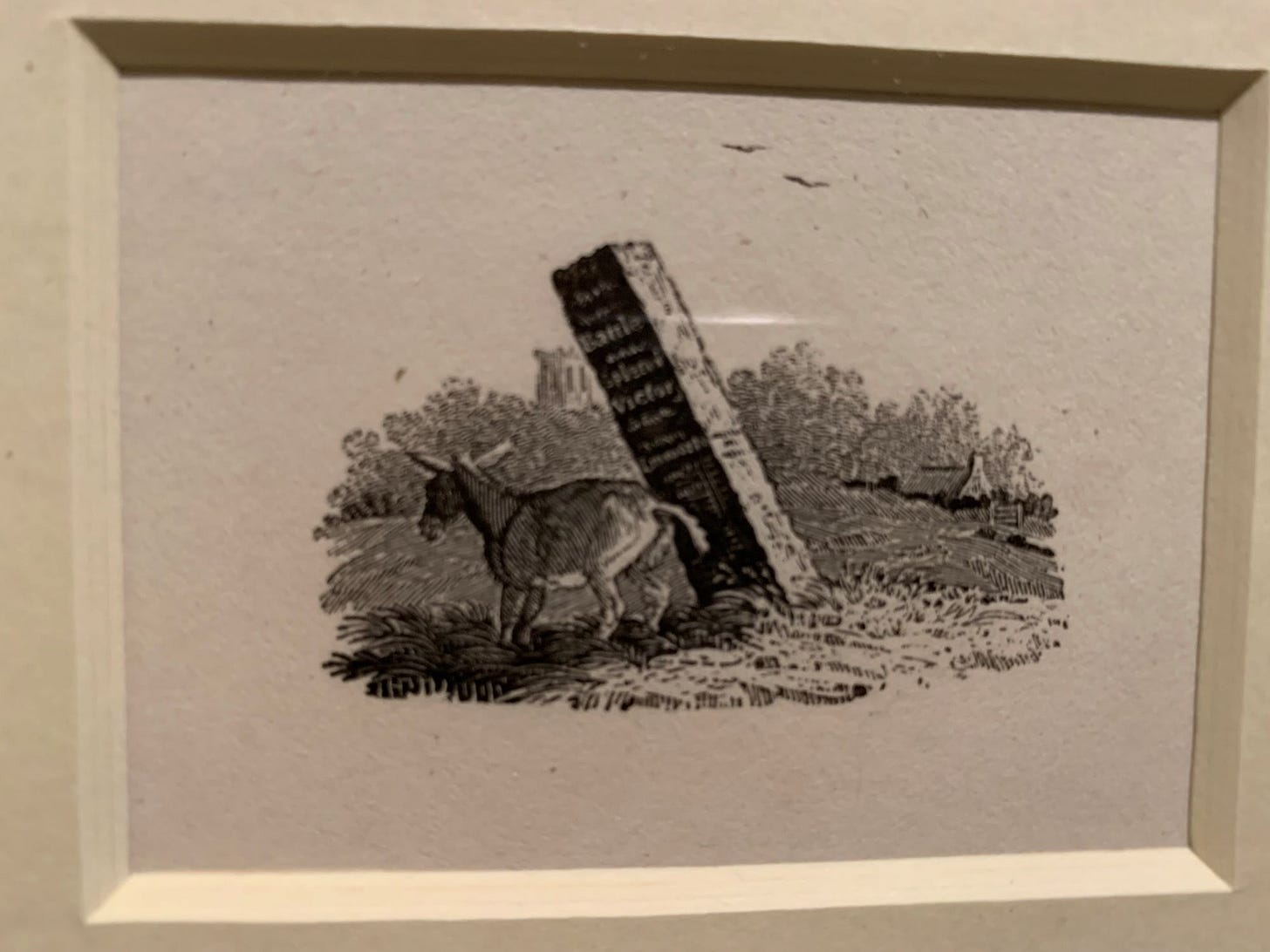 Bewick’s sense of humour, plus his moral sensibility, is evident again in his tale-piece engraving of a donkey scratching its bum on a war memorial. Such is life.
