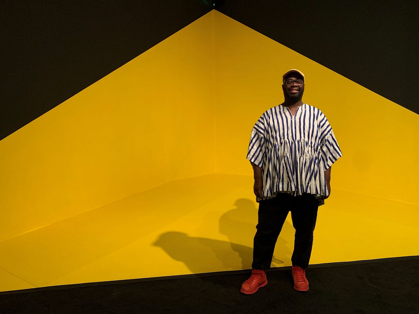 Down on the ground floor, the yellow paint was still wet in Harold Offeh’s exhibition, The Mothership Collective 2.0.